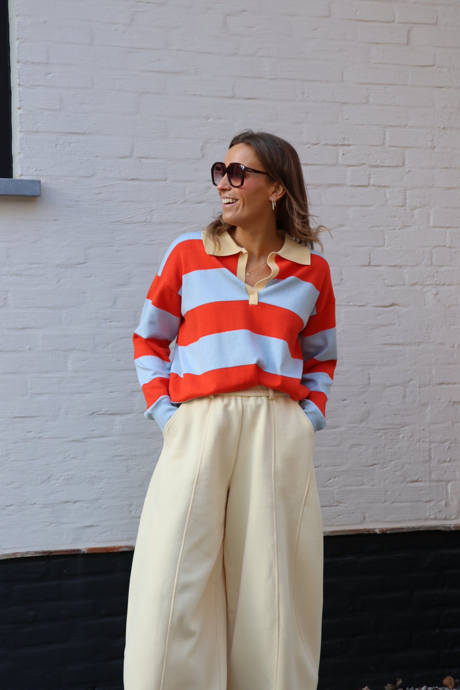 Goed zittende broek en mooi te combineren met de Ellen polo en het blauwe hemdje uit een van de vorige collecties. Jammer genoeg zit het weer nog niet mee om ze al volop te dragen.