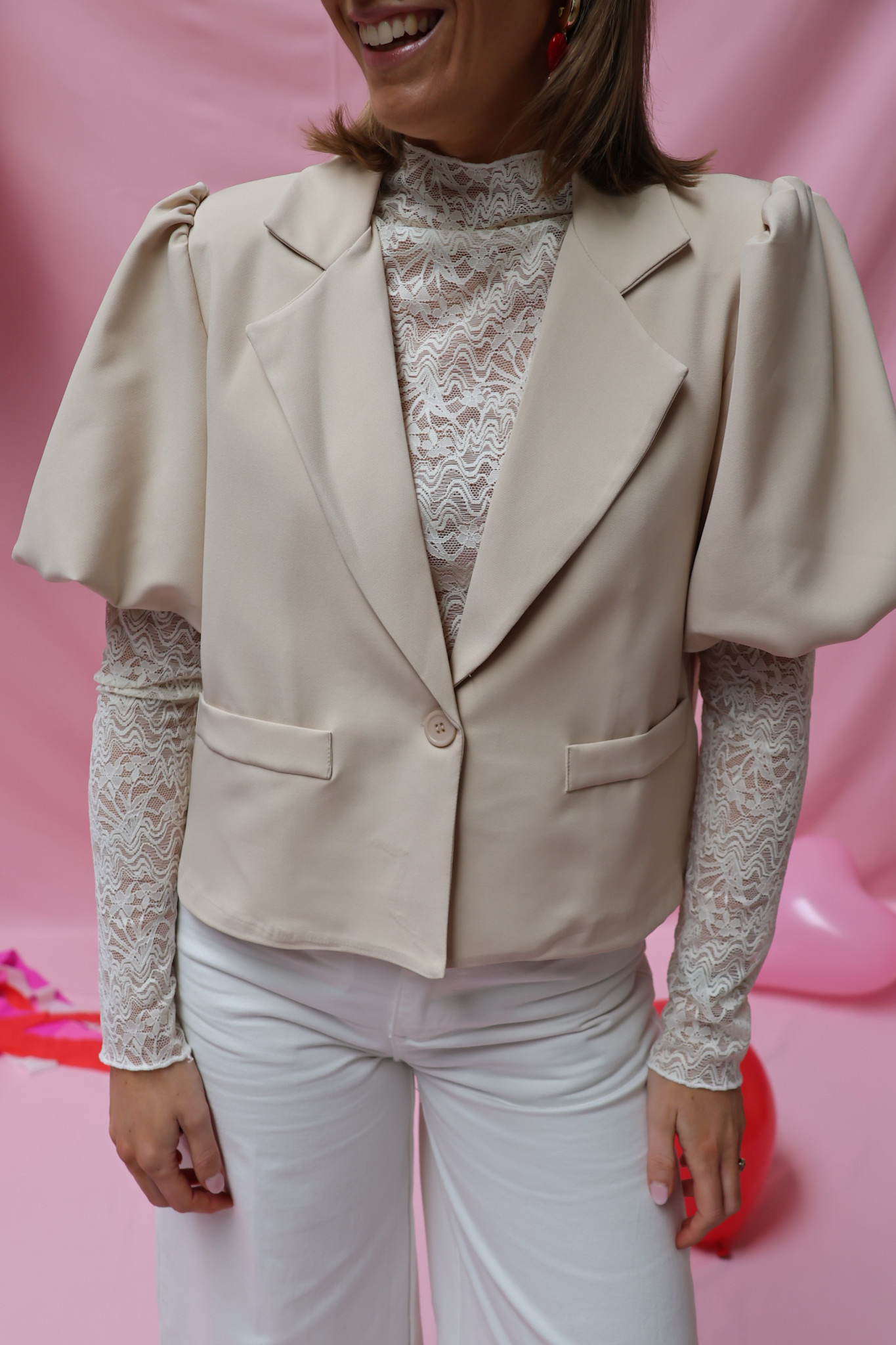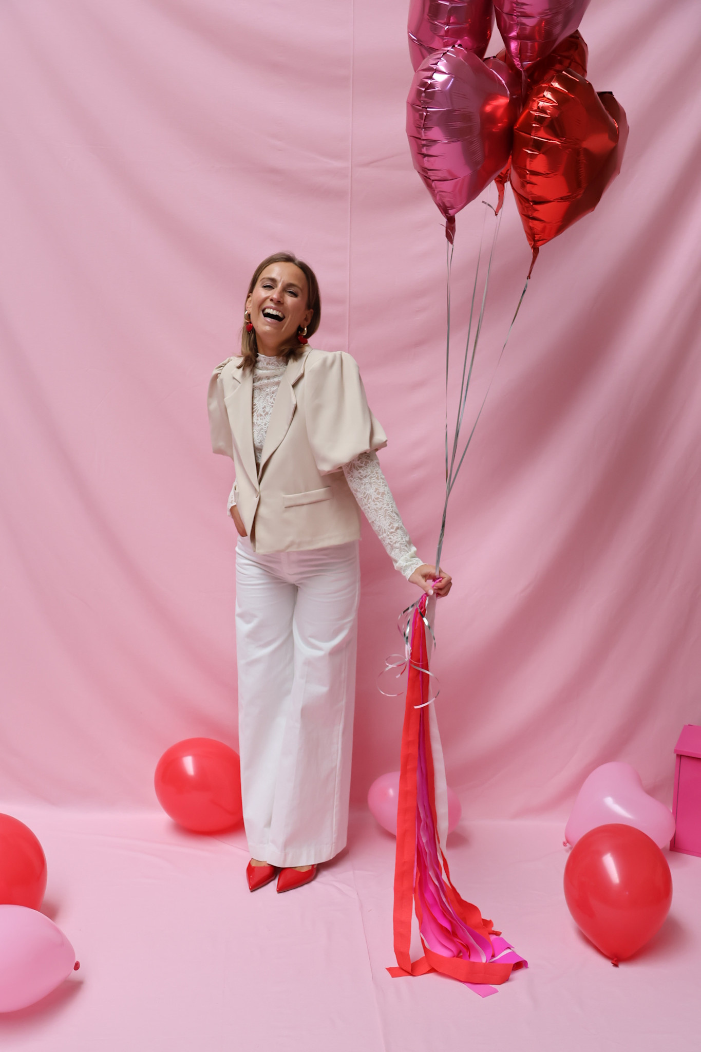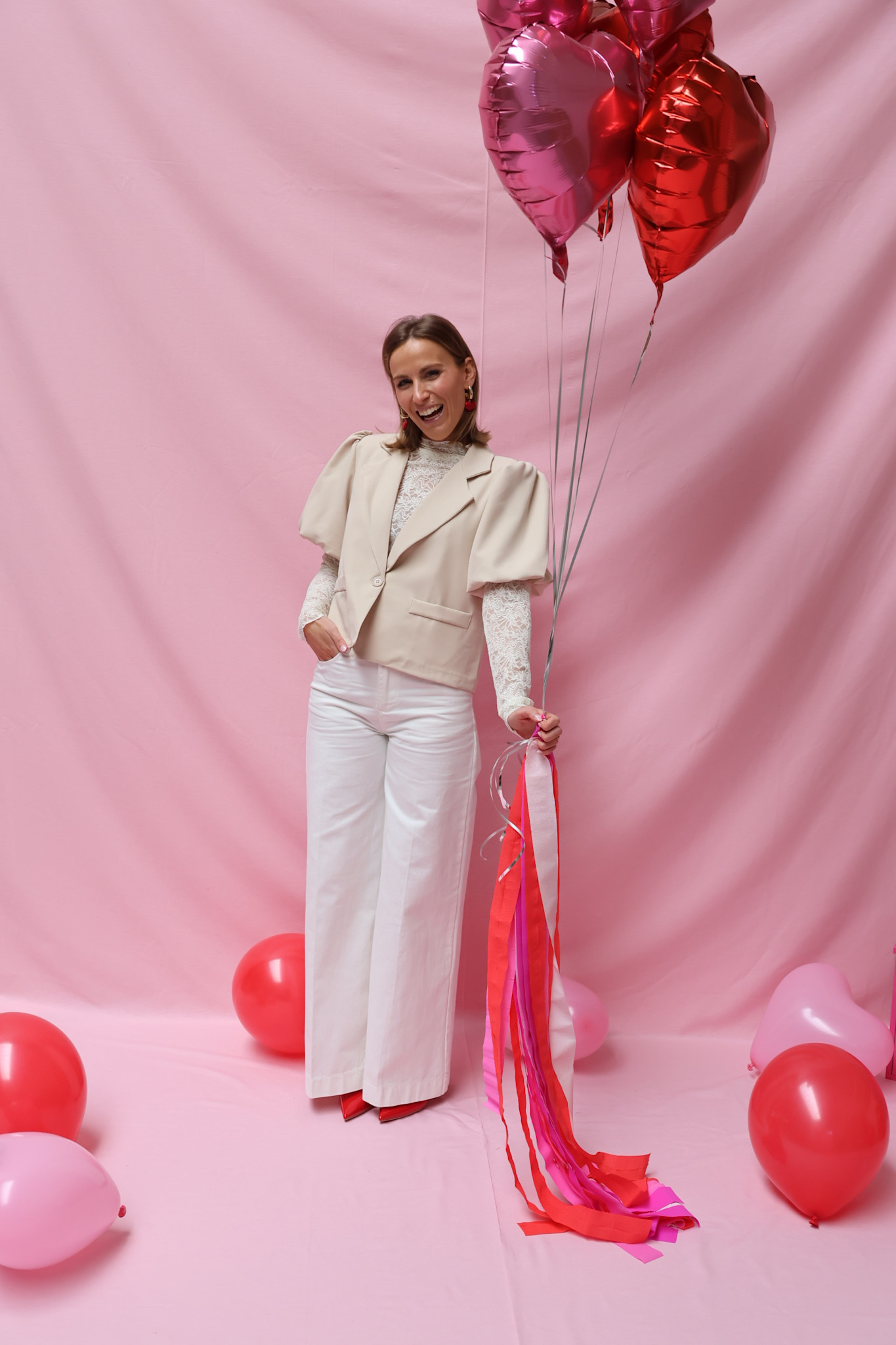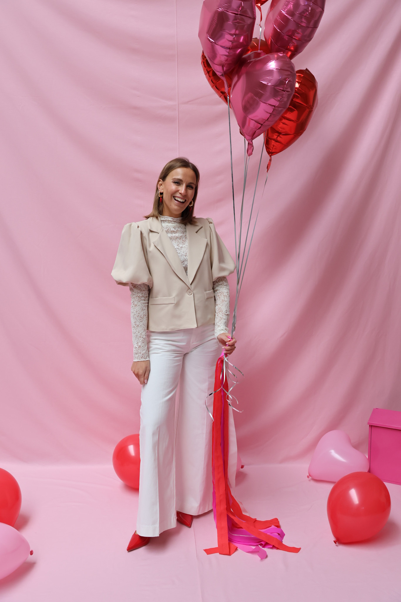 Je kunt de blazer ook dragen zonder iets onder (dan is je bh wel zichtbaar; ik zou er een knoopje laten innaaien of een héél mooie kanten top onder dragen).