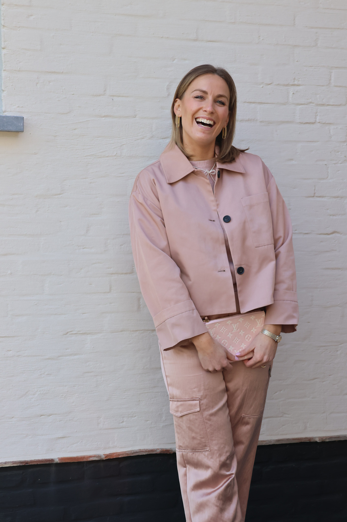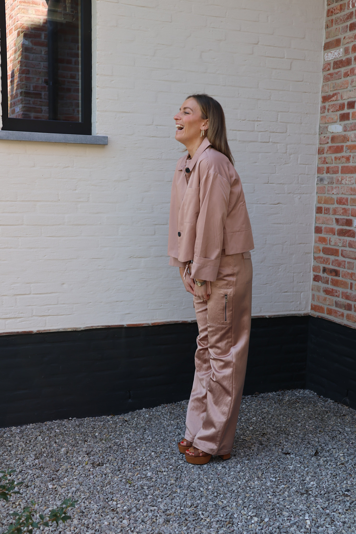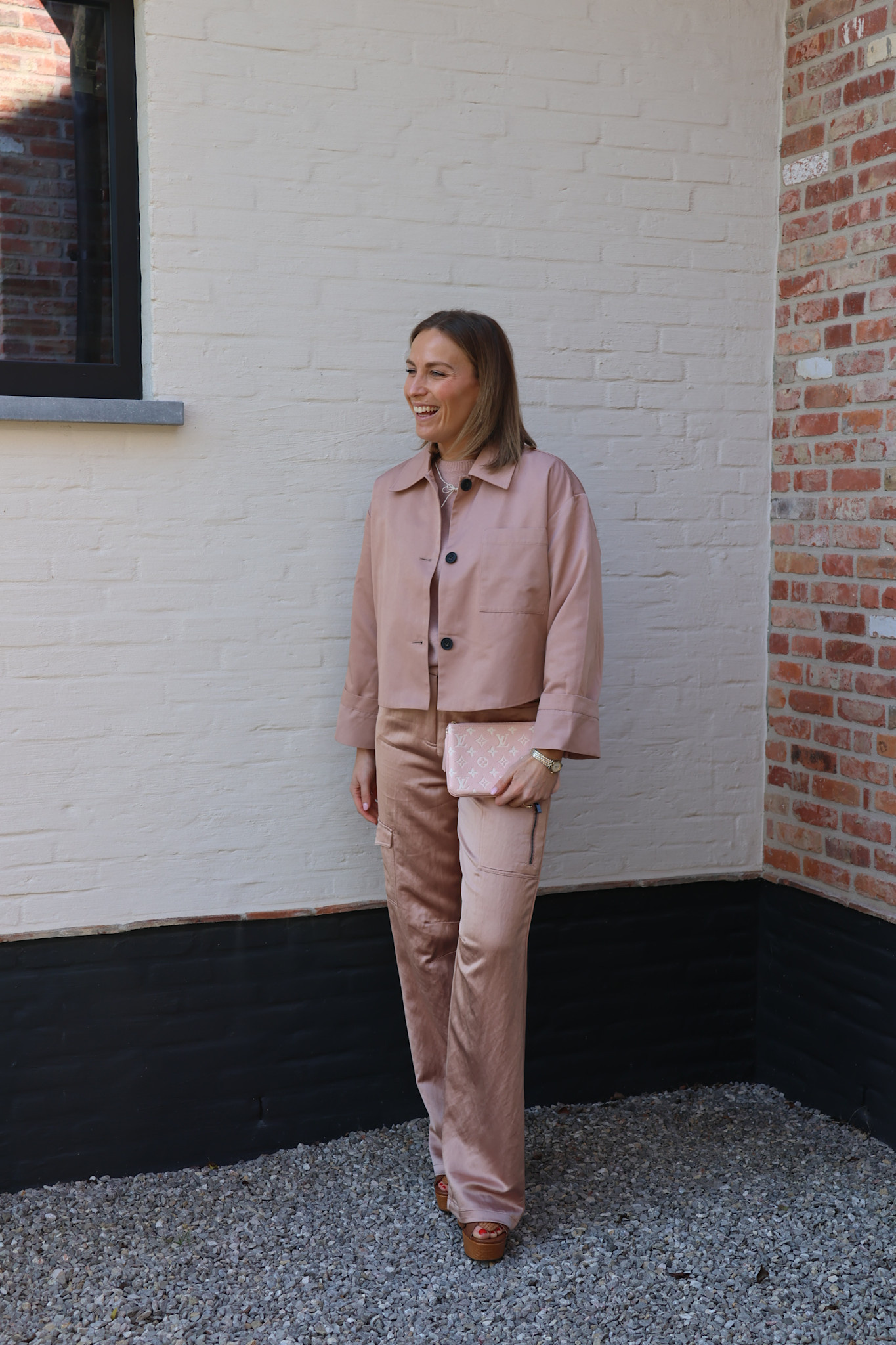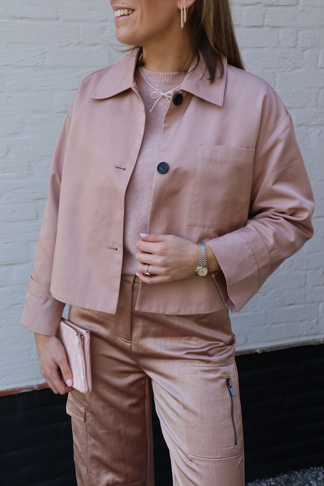 INFO YAYA: Dit stijlvolle korte jack is gemaakt van zware satijnstof en heeft een oversized pasvorm. Het jack is voorzien van een klassieke kraag, grote knopen en een praktische borstzak. De opgerolde mouwen zorgen voor een nonchalante touch, ideaal voor een moderne en verfijnde look. Combineer het met een bijpassende broek voor een chic geheel.