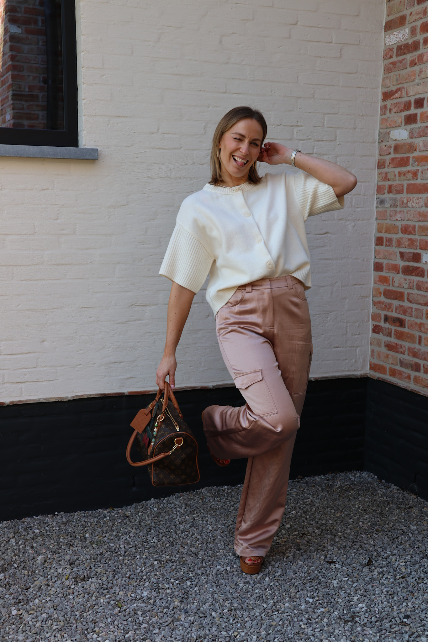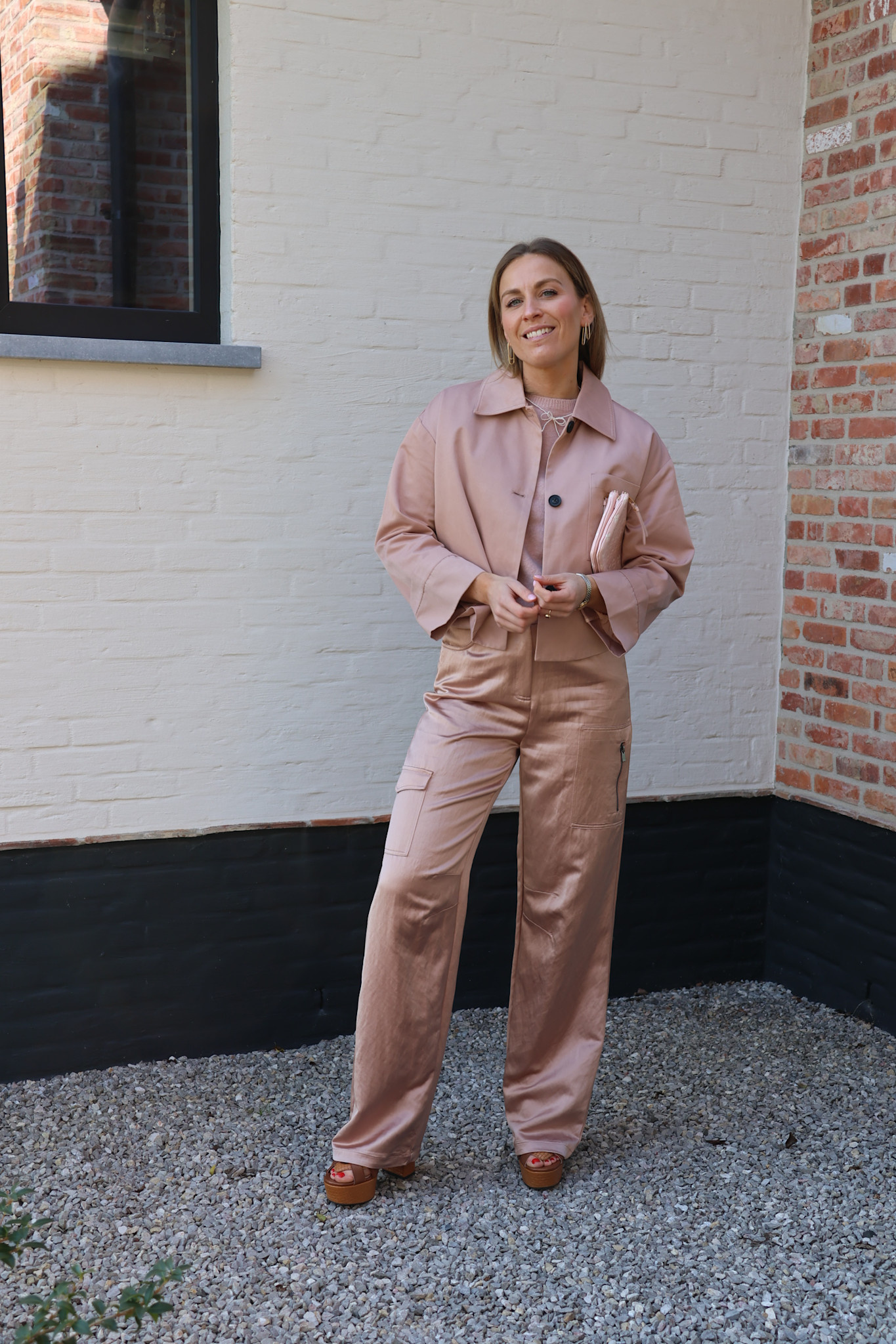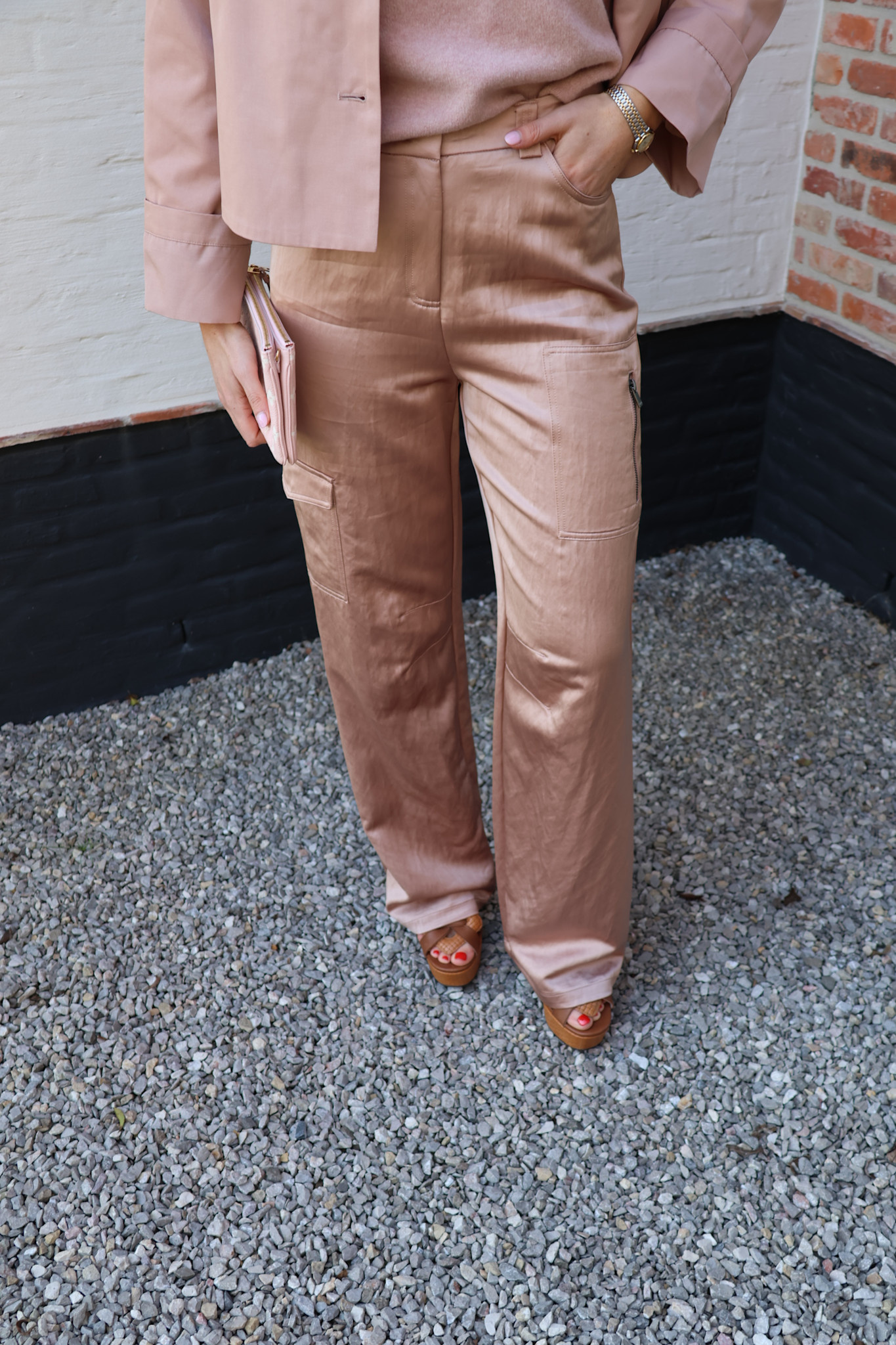 De satijnen stof maakt de broek zeer vrouwelijk maar door het cargo model is de broek tegelijk stoer
