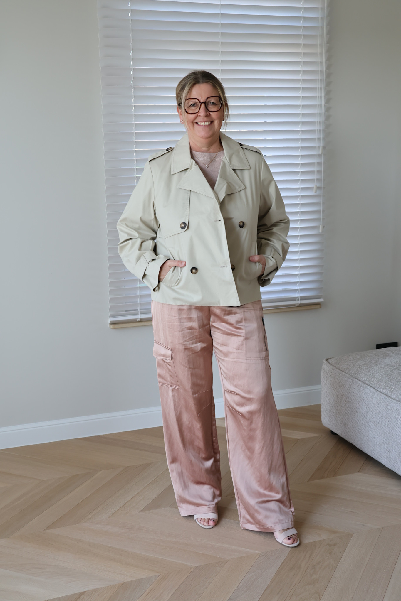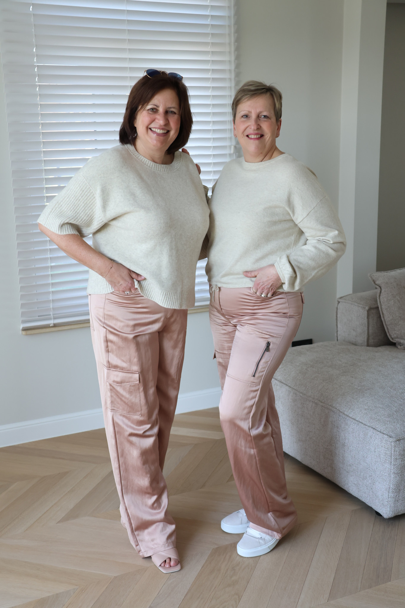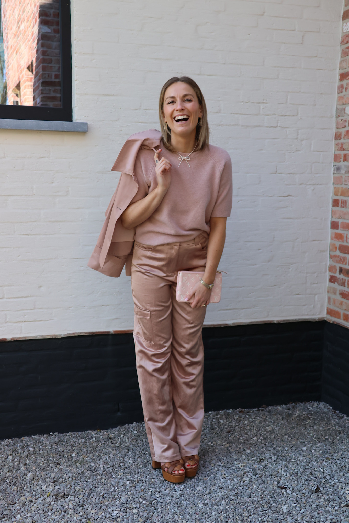 De satijnen stof maakt de broek zeer vrouwelijk maar door het cargo model is de broek tegelijk stoer